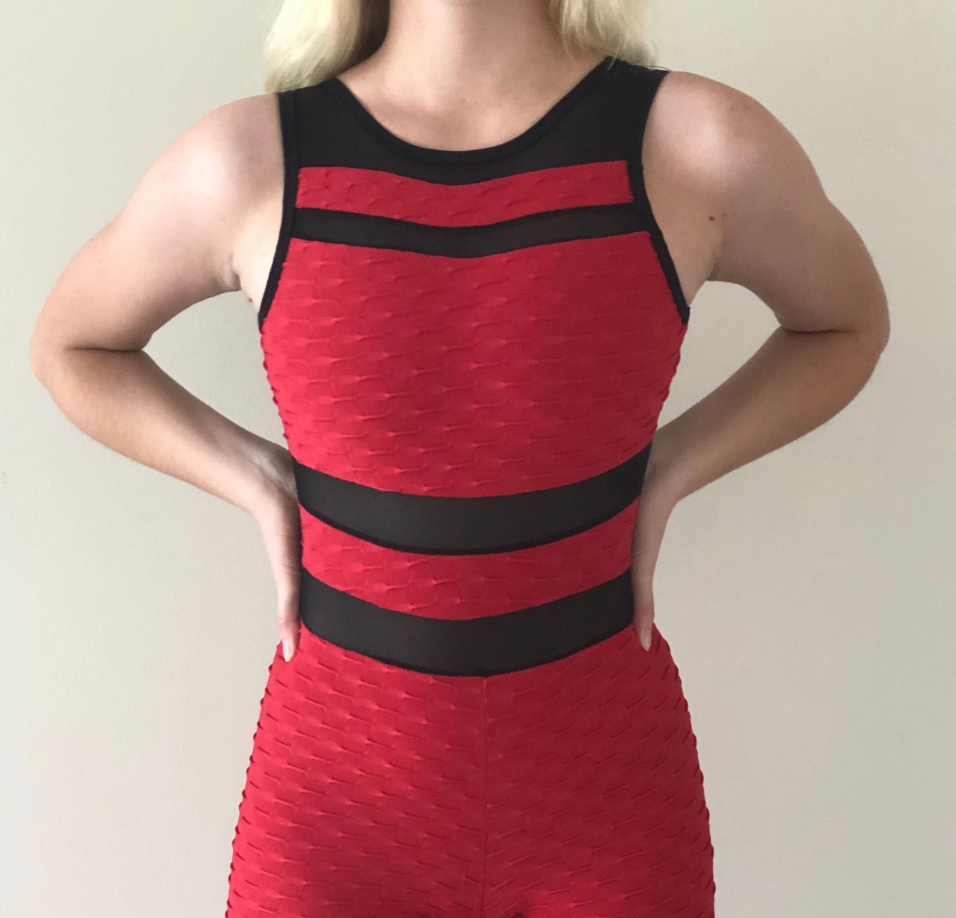 Model measurements: Height 5'8", Waist 24", Bust 34", Hips 34"